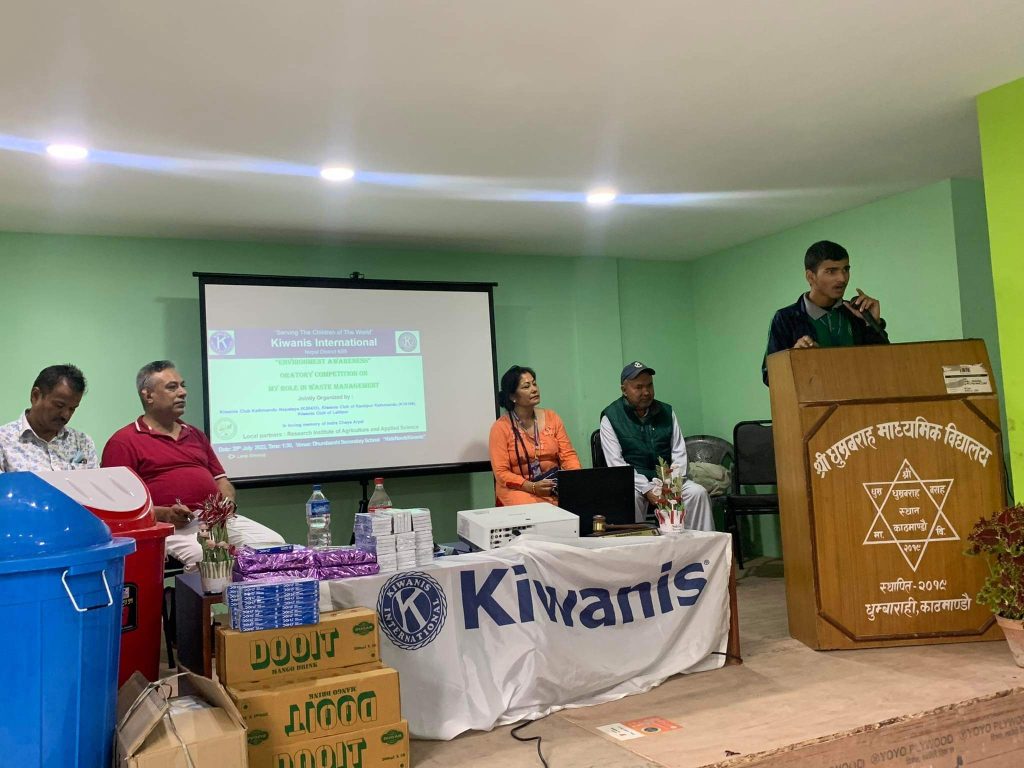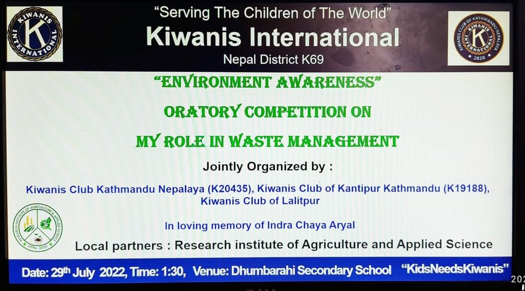 On July 29th 2022, Shrawan 13, 2079 Kiwanis club of Kathmandu Nepalaya, Kantipur and Lalitpur with Research Institute of Agriculture and Applied Science jointly organized Environmental awareness program at Dhmbarahi secondary school, Dhumbarahi . We organized oratory competition on topic’ My role in waste management. The overall objective of this program is to make our future generation to be responsible for protecting environment for coming generations to come.